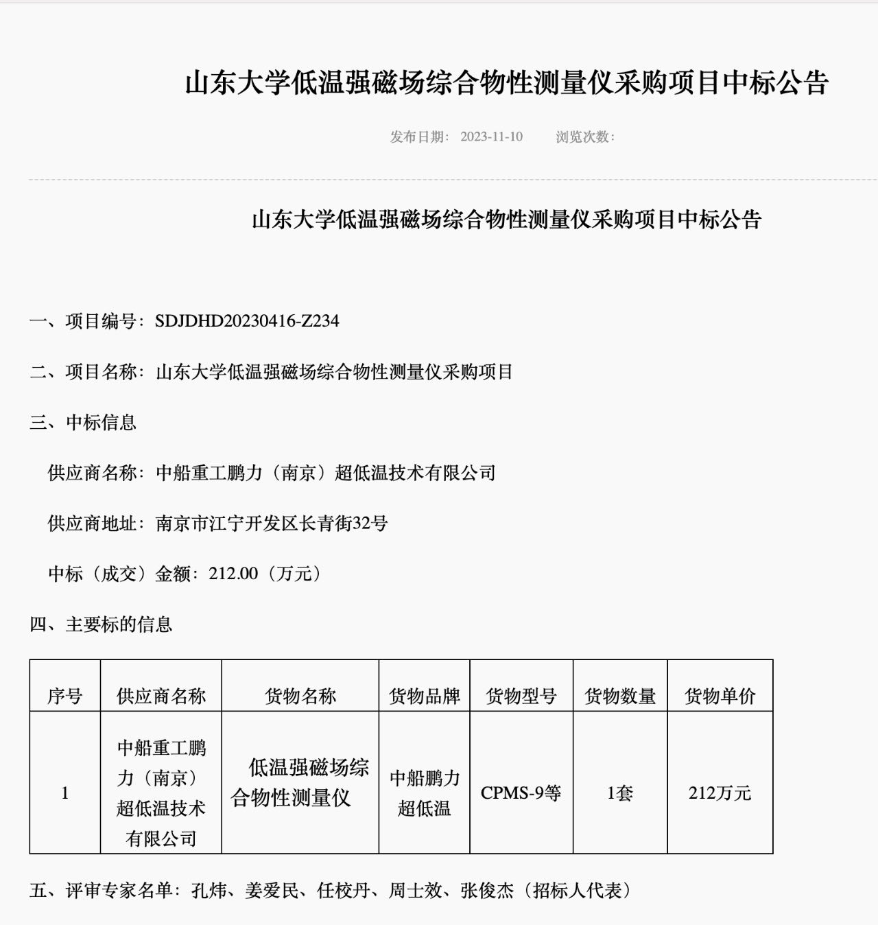 山东大学低温强磁场综合物性测量仪采购项目中标公告