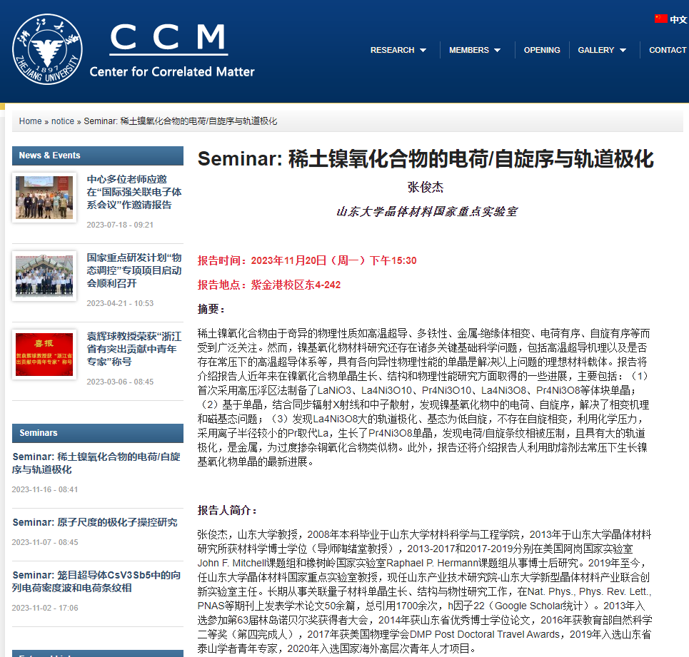 张俊杰教授受邀访问浙江大学关联物质中心并做题为"稀土镍氧化合物的电荷/自旋序与...