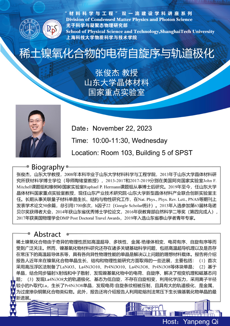 张俊杰教授受邀访问上海科技大学物质科学与技术学院并做题为"稀土镍氧化合物的电荷...