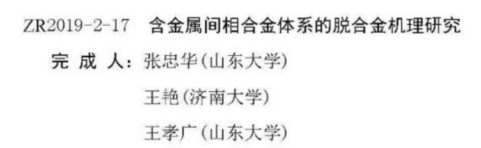 2019年12月25日,山东省人民政府发布《关于2019年度山东省科学技术奖励的决定》(鲁政发〔2019〕16号)。课题组成果“含金属间相合金体系的脱合金机理研究”获山东省自然科学二等奖(完成人:张忠华,王艳,王孝广)。