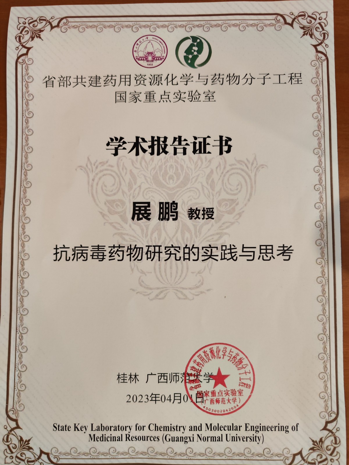 梁宏教授为展鹏教授颁发国家重点实验室报告证书