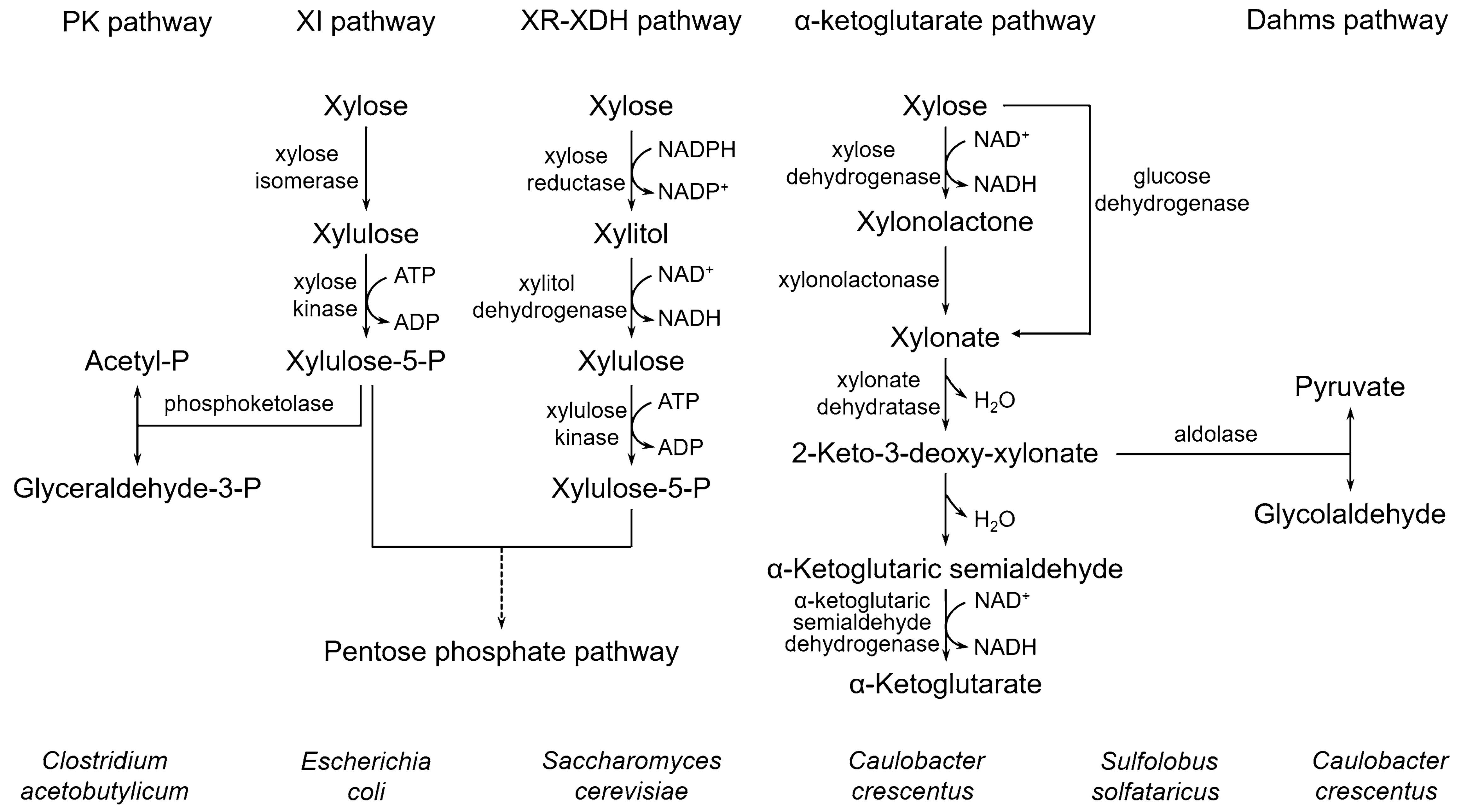 Biochemical routes for uptake and conversion of xylose by microorganisms
